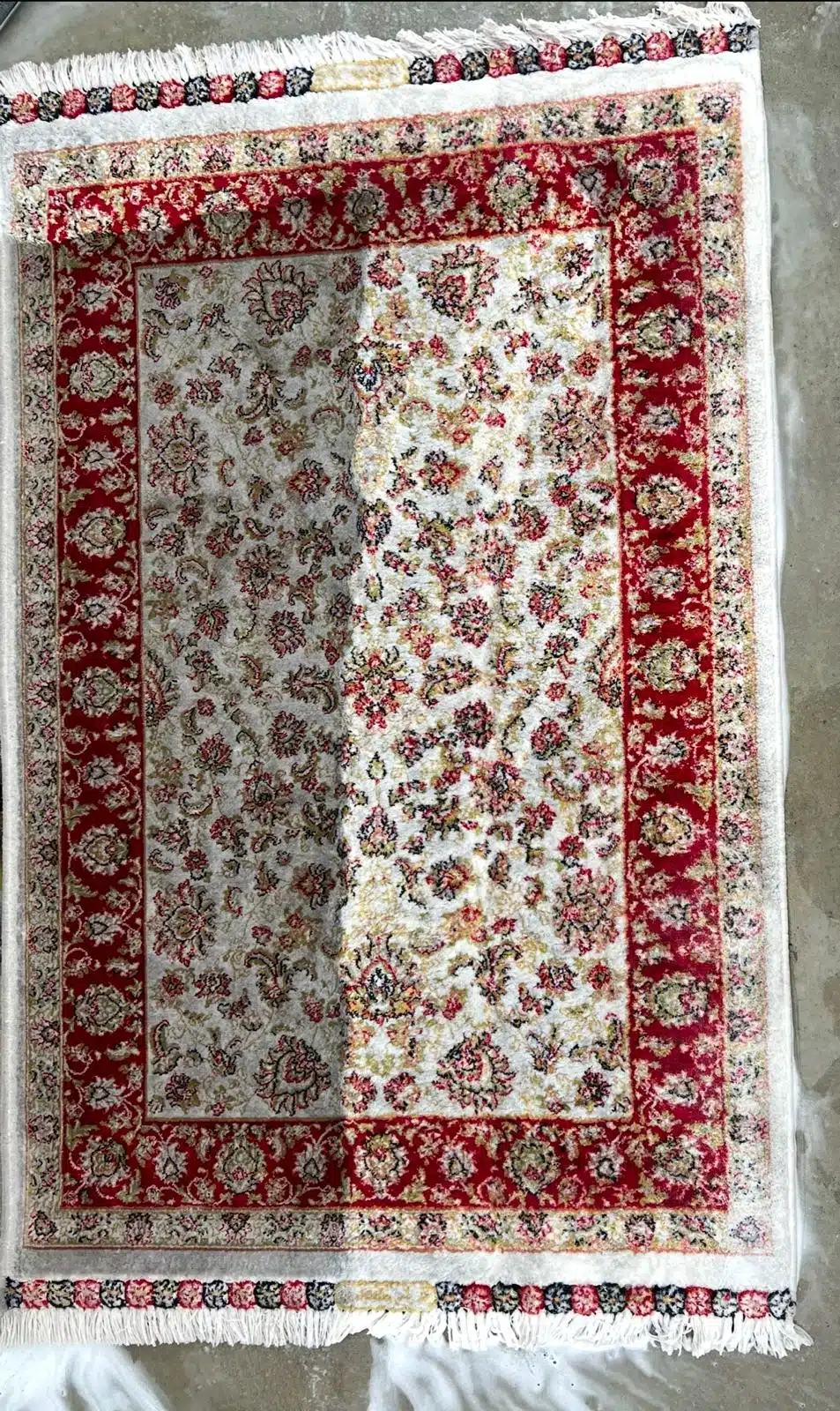 Le nettoyage est effectué uniquement à la main, selon des techniques adaptées à la fragilité de chaque tapis ancien. Plusieurs bains peuvent être réalisés si nécessaire. Pour les tapis en soie ou les modèles anciens aux couleurs sensibles, une fixation préalable est appliquée afin d’éviter tout dégorgement.
